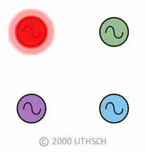 The red-colored neuron in Figure 5 is referred to as an inhibitory neuron. Like the green neuron, it also makes a synaptic contact with the blue postsynaptic neuron. It also releases a chemical transmitter messenger, but the consequences of the transmitter from the blue cell binding to receptors on the postsynaptic cell is opposite to the consequences of the transmitter released by the green neuron. The consequence of action potential in the red presynaptic neuron is to produce an increase in the membrane potential, i.e. a hyperpolarization of the blue postsynaptic neuron. Therefore the membrane potential is farther away from threshold. This type of potential is called an inhibitory postsynaptic potential (IPSP) because it tends to prevent the postsynaptic neuron from firing an action potential. This is a “stop signal” for the postsynaptic cell. So the green neuron says “go” and the red neuron says “stop”. Now what is the postsynaptic neuron to do?