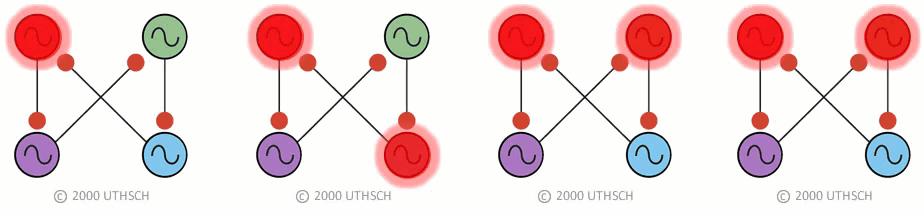 So clearly the neurons need to be coupled. One way of doing this is to use a recurrent inhibition circuit consisting of four coupled neurons to form a so called “ring” circuit where each neuron in the circuit has endogenous bursting activity and each neuron is coupled to the next with an inhibitory synaptic connection (Figure 19A).